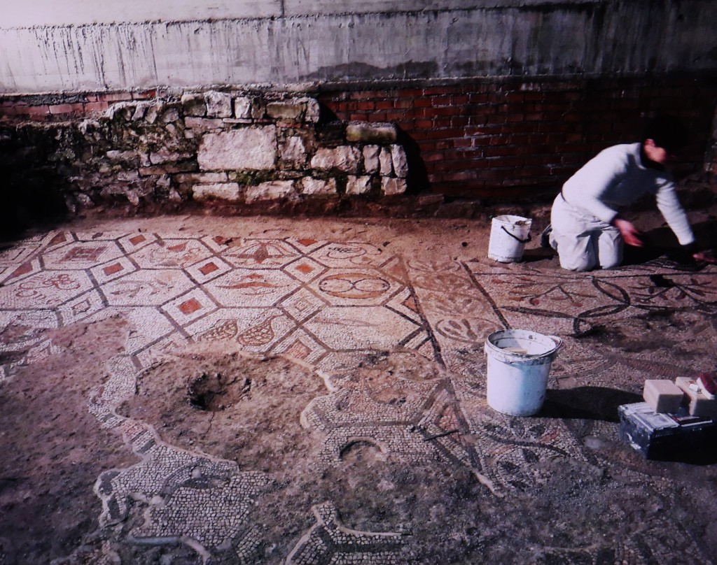 Vediamo anche una elevatissima concentrazione di archeologi, volontari e studenti al lavoro, con aree di raccolta del materiale rinvenuto : e gli scavi sono comunque limitati dal fatto che Aquileia è un paese vivo, dove abitano oltre 3000 persone. Gli aquileiesi ci hanno detto che in questo territorio anche il semplice lavoro dell’orto, la dissodazione del terreno, o la preparazione di uno scavo in giardino, spesso porta alla luce antichi lumi in terracotta, tessere o interi mosaici, monete, antichi oggetti : un semplice buco per la riparazione di una tubatura può portare alla luce il disegno di un antico mosaico. E così molte delle aree visitabili portano ancora il nome dei proprietari del fondo in cui sono stati rinvenuti (le case romane del fondo Cal ; la Domus di Tito Macro dell’ex fondo Cossar…) , che sono poi state acquistate dallo stato. E’ un luogo dove la storia è viva e presente, tutt’altro che dimenticata. Possiamo anche seguire il racconto e la documentazione fotografica degli scavi dei vari siti : e così vediamo le mucche, il letamaio e la stalla Violin sotto cui riposavano i bellissimi mosaici della Domus e del palazzo episcopale.