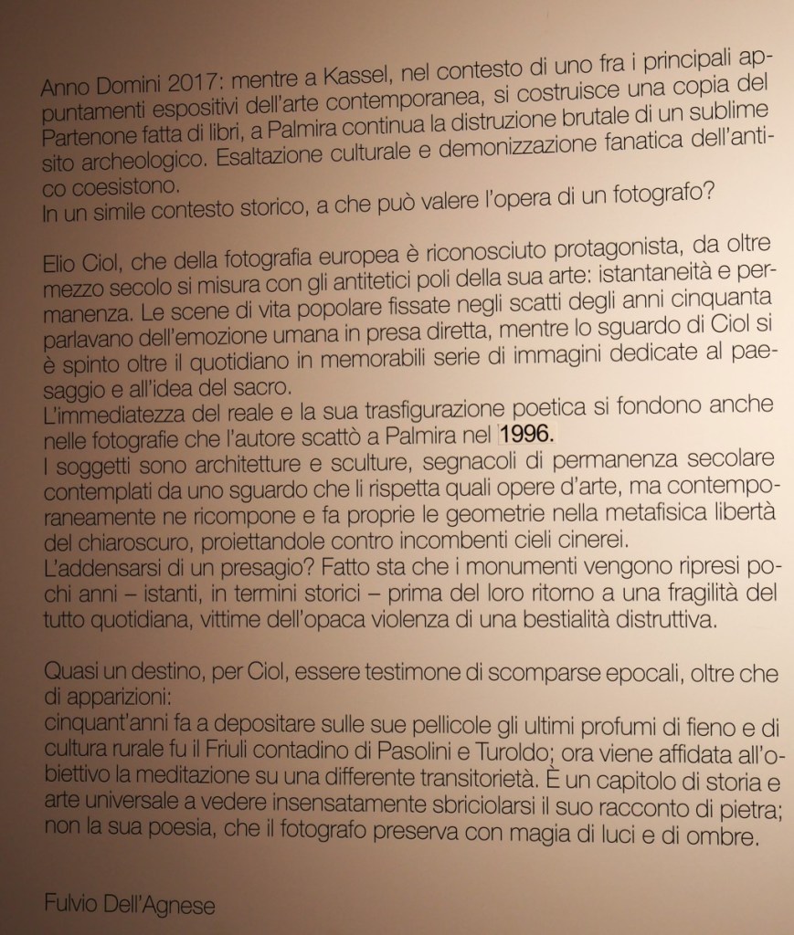 E questi luoghi – in cui la memoria sembra animarsi di nuova vita – accolgono ancora altra arte, come la mostra fotografica Sguardi su Palmira, del fotografo Elio Ciol, con immagini riprese il 29 marzo 1996 : cioè prima della distruzione della antica città siriana, la Sposa del deserto, da parte dei terroristi dello stato islamico durante la guerra civile nel 2013. La memoria e la bellezza da un lato, la distruzione e la morte dell’anima dall’altro.