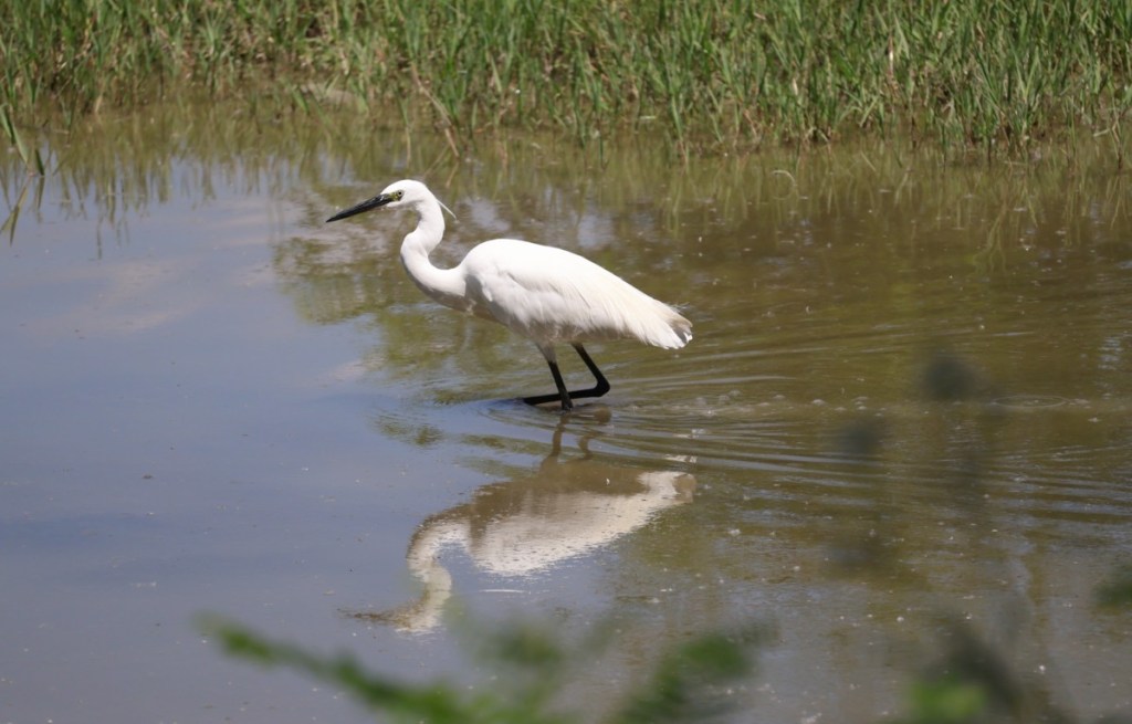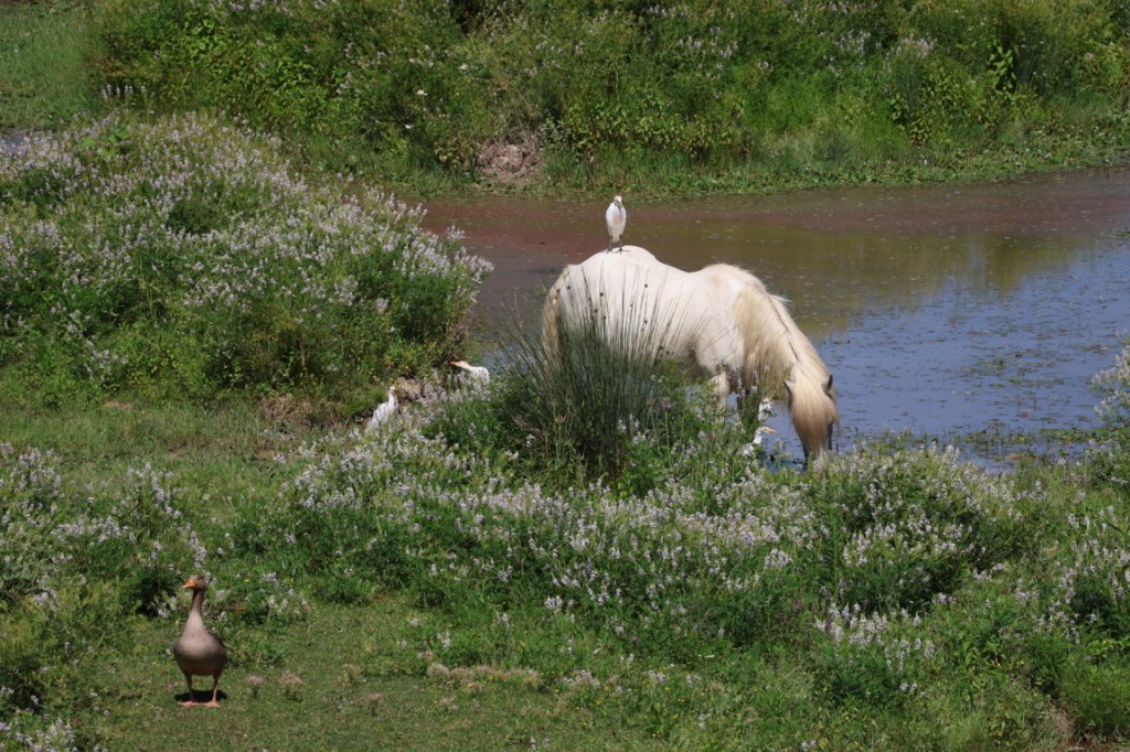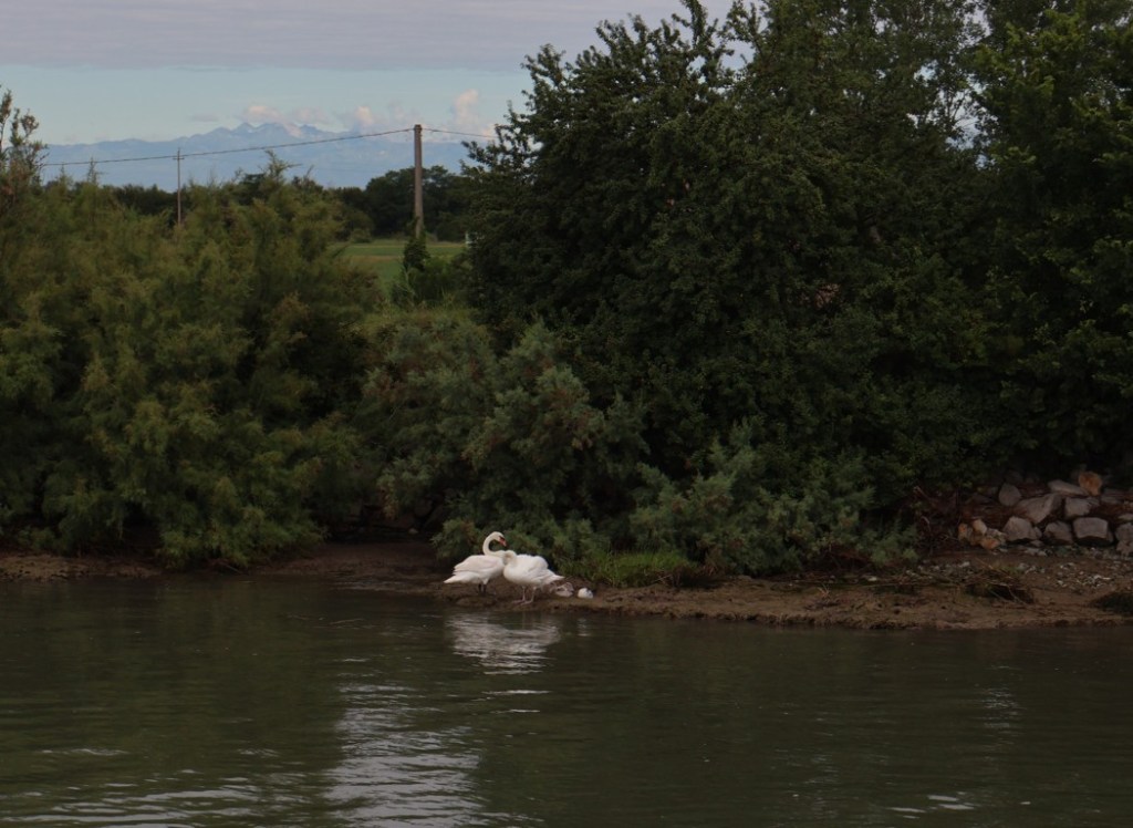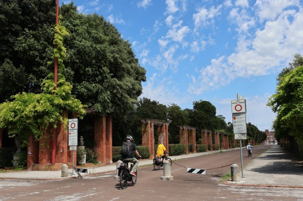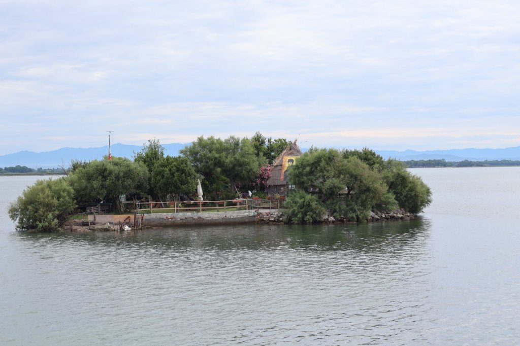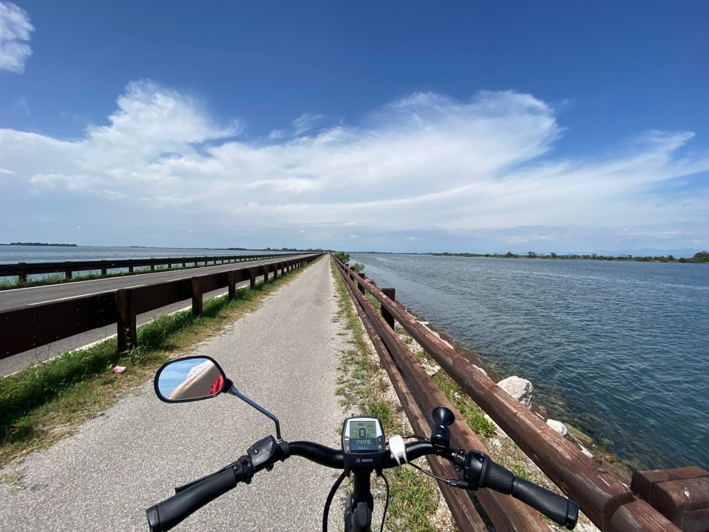 Ed una volta abbiamo preso la prima corsa del mattino, percorrendo le poco profonde vie sommerse , in cui il comandante deve essere esperto ed attento a non arenarsi (il barcone segue vie che hanno una profondità anche di pochi centimetri in alcuni tratti ) , avvicinandoci alle isolette , di cui abbiamo ascoltato alcuni racconti : come quella annunciata dal chiocciare delle galline del pollaio, affiancato da un modesto riparo, di proprietà della signora Caterina, arzilla novantenne che ogni mattina – da tutta la vita – la raggiunge con la propria barca a remi per nutrire le galline, raccogliere le uova, coltivare l’orto ed infine controllare sempre in barca a remi le vicine aree di pesca/allevamento ; quelle con una solitaria costruzione dal tetto in paglia che sembra uscita da un libro di favole ; quella con una più elegante casetta dove si è incredibilmente tenuta la mostra degli abiti della principessa Sissi ; quella più elaborata con una casa nascosta dagli alberi di un fitto giardino, dotata di darsena e spiaggetta, un vero e proprio mondo a parte. E così, trasportati da questi racconti, che muovono la nostra immaginazione, ci muoviamo lentamente in un orizzonte surreale, in cui le direzioni vengono indicate da improvvisi cartelli che spuntano circondati dalle acque. Oltre a questi racconti e a queste suggestioni, gli operatori del barcone, molto simpatici e schietti, non ci hanno aiutato a caricare e scaricare le biciclette attraverso la stretta pensilina di attracco , bensì hanno caricato e scaricato le nostre biciclette, sollevandoci da ogni timore o fatica. E questo intendo quando parlo di essenziale premura e presenza delle persone che abbiamo incontrato in questa terra.